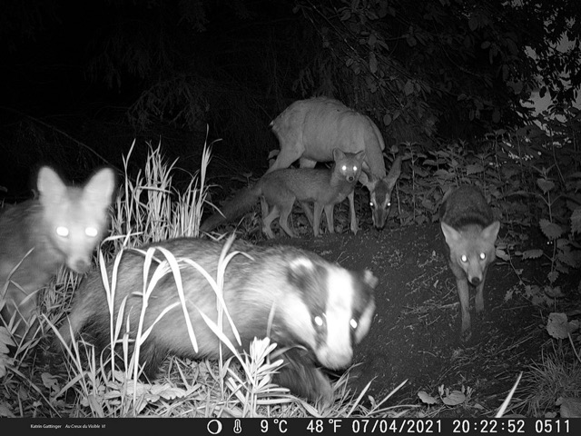 « Au creux du visible » de Katrin Gattinger est une compilation d’instants t . La nuit est profonde et cette œuvre nous regarde. Le croisement de notre regard et celui du monde animal semble interroger notre proximité relative/ou notre éloignement relatif. « Au creux du visible » est constituée de plusieurs images dupliquées en nombreuses reproductions. La démultiplication et la diffusion interrogent la pluralité des interrogations de ces regards croisés…