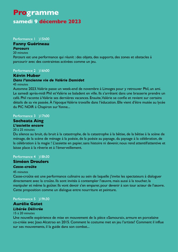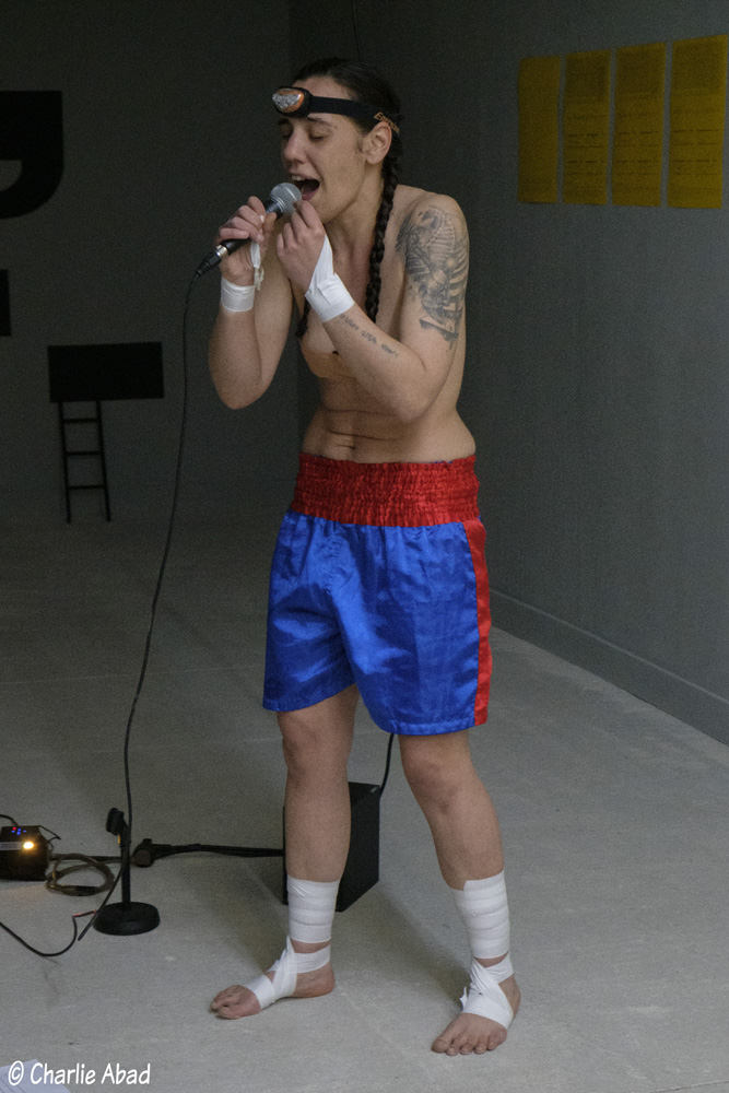 samedi 14 décembre 2024 17h00Mégalomania (30 km2) lecture-performance d’Anaïs MARION 19h00Art Noble vs Noble Art dans une exploration d’équilibriste sur Boxer sur porcelaine – au seuil de la chute performance engagée de Florent LAMOUROUX (artiste) avec Yamina KHERRADJI (boxeuse) sur une œuvre praticable de Kristina DEPAULIS réalisée avec Christian COUTY