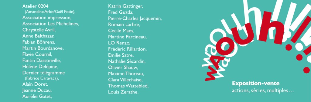 Artistes ayant participé à l’installation : Joao Alcatrao, Muriel Carcagno, Christian Couty, Guillaume Damry, Emilie Flöge, Mette Galatius, Catherine Hervé, Gilles Méraud, Anne Merlet, Guy Meynard, Camille Nicaud, Joo-Hyun Park, Jean-Louis Puivif, Marie-Evelyne Savorgnan.
