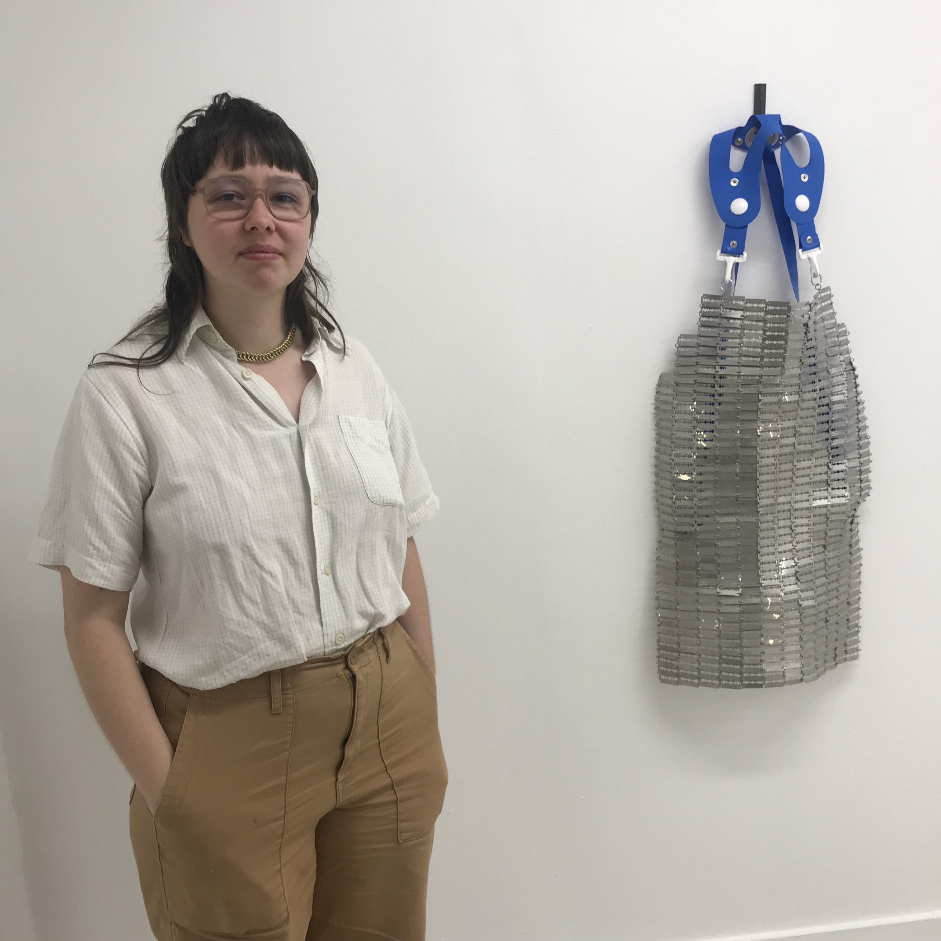 Tels des fantômes traversant les murs ou errant dans un coin, les œuvres d’Estelle Majani s’intéressent aux lieux transitoires, aux zones de seuil liminales qui parcourent nos espaces contemporains. En passant par la sculpture, l’installation, l’image imprimée ou le texte poétique, l’artiste explore ces endroits particuliers qu’iel désigne «entre-lieux». Les formes et matériaux employés, comme la cotte de maille ou les objets industriels renvoient à des lieux troubles, non situés, mais qui peuvent rappeler des espaces contrôlés, chargés d’une violence latente, comme les abattoirs, les usines, ou encore le milieu médical. Les images et objets pourtant familiers tombent dans l’étrangeté. Errant dans des limbes aux murs blancs et aux néons grésillant, le.a regardeur.euse déambule à la manière d’un spectre à travers des morceaux de corps abandonnés.