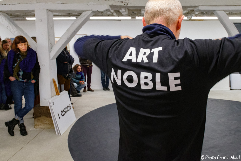 Performance engagée de Florent LAMOUROUX (artiste) avec Yamina KHERRADJI (boxeuse) sur une œuvre praticable de Kristina DEPAULIS réalisée avec Christian COUTY.